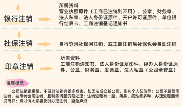 1、銀行賬戶:帶公章+開戶許可證+法人身份證,先銷一般戶再銷基本戶;